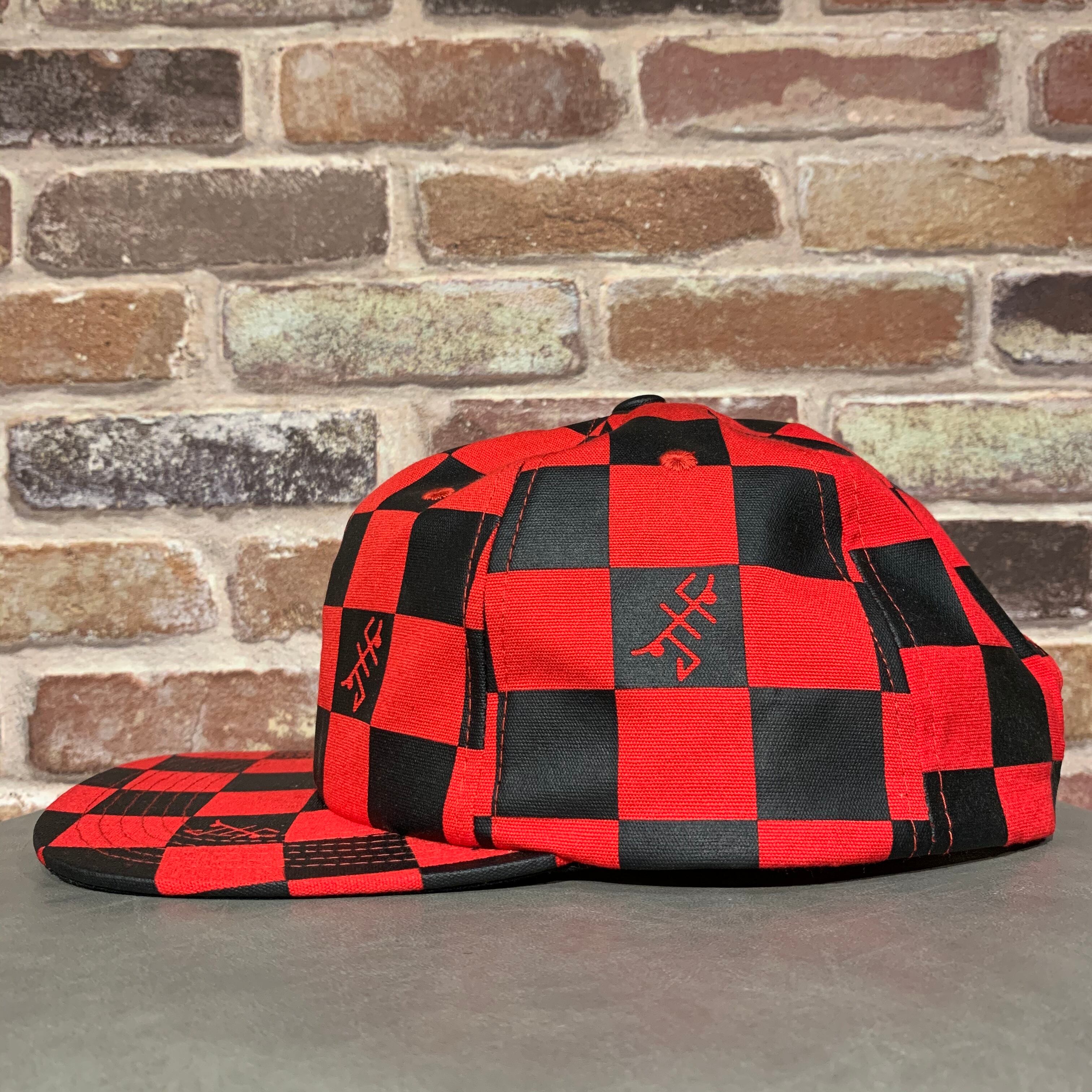 ブラックとレッドのチェッカーボード柄の個性的なアイテム。 バッグにはJUST HAVE FUNの刺繍入り。