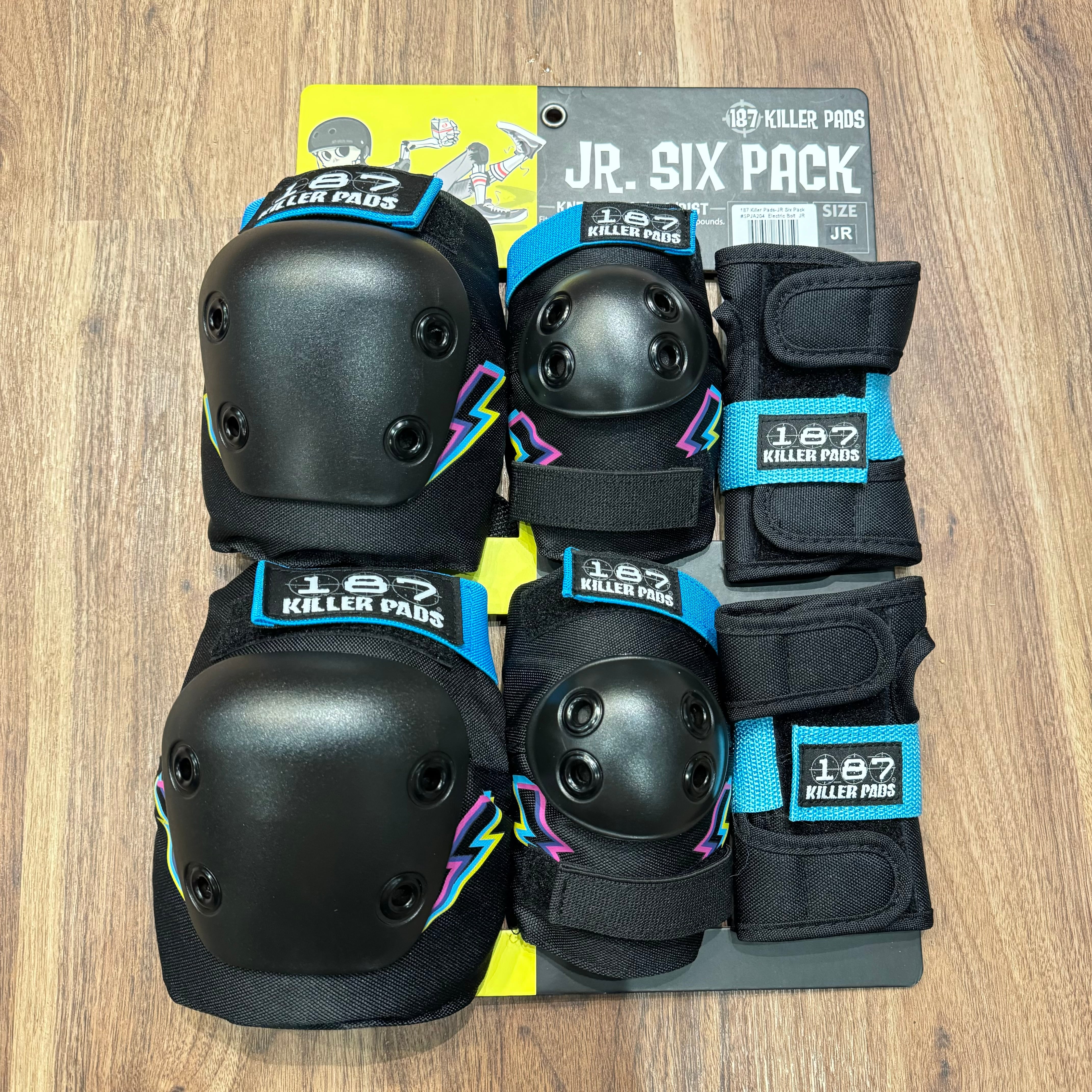 【187 KILLER PADS】Jr. six packは、子供たちの遊びをしっかりとサポートするプロテクターセットです。ニーパッド、エルボーパッド、リストガードの3つがセットになっており、スケートボードや自転車などアウトドアアクティビティでの怪我を防ぐことができます。安全装備をしっかり備え、安心して楽しく遊べるのが特徴です。