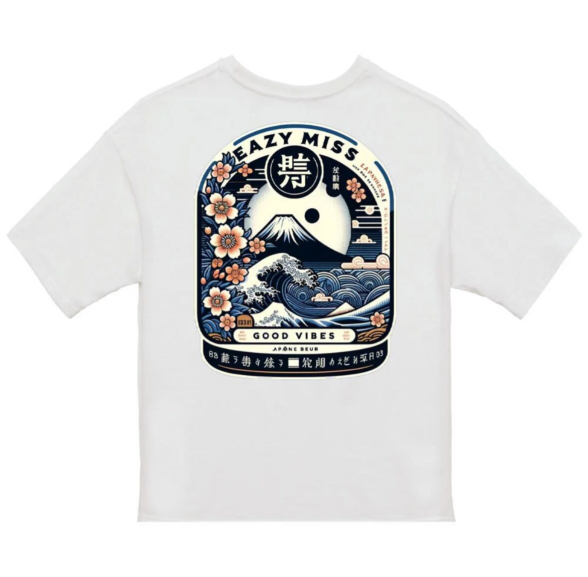 首元のリブは、丈夫なダブルステッチ始末で長持ちすることが期待できます。バックデザインには、EAZY MISS独自のお酒のラベルを模したグラフィックが大きくプリントされており、遠くからでも目を引く存在感を放ちます。