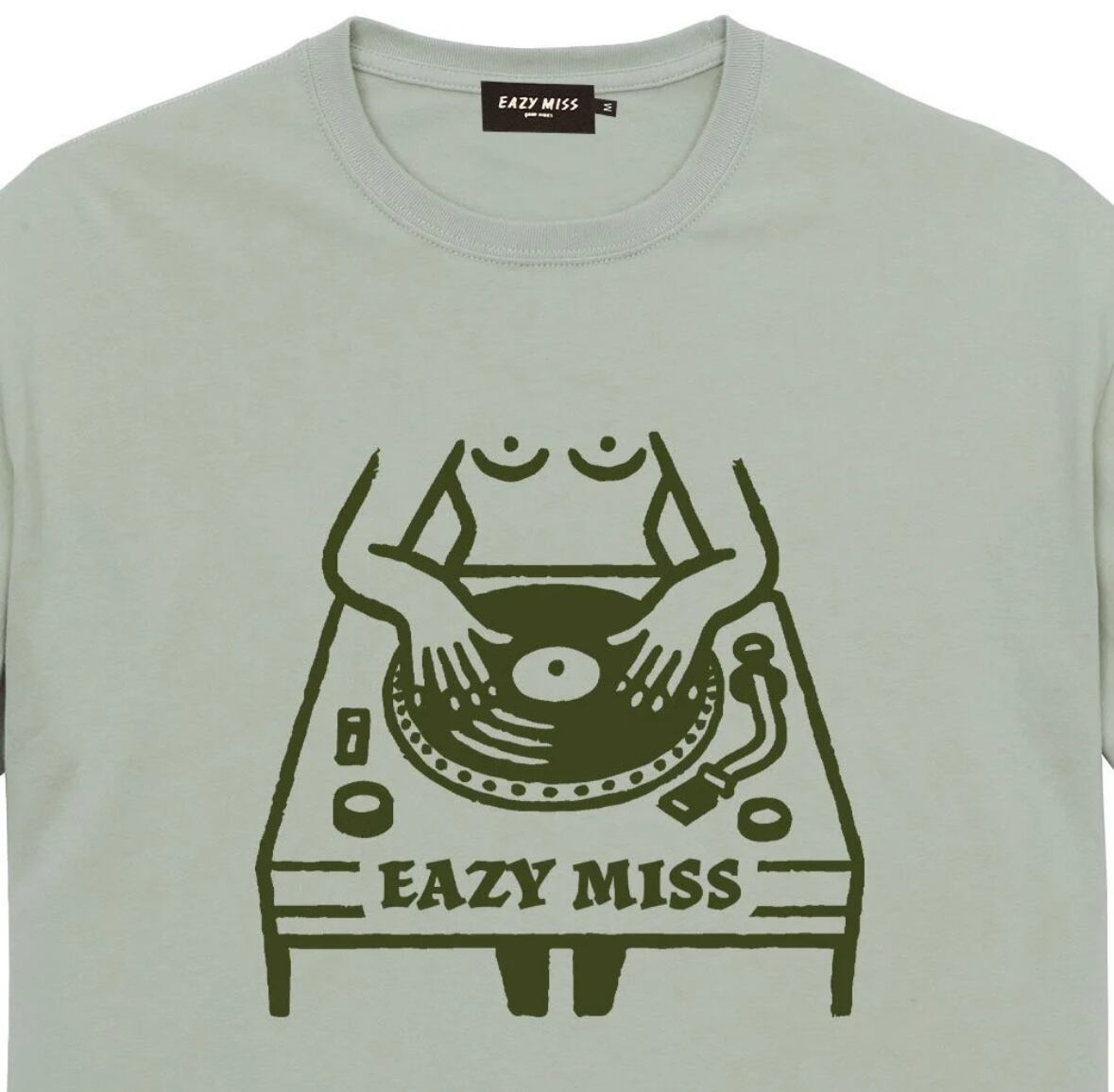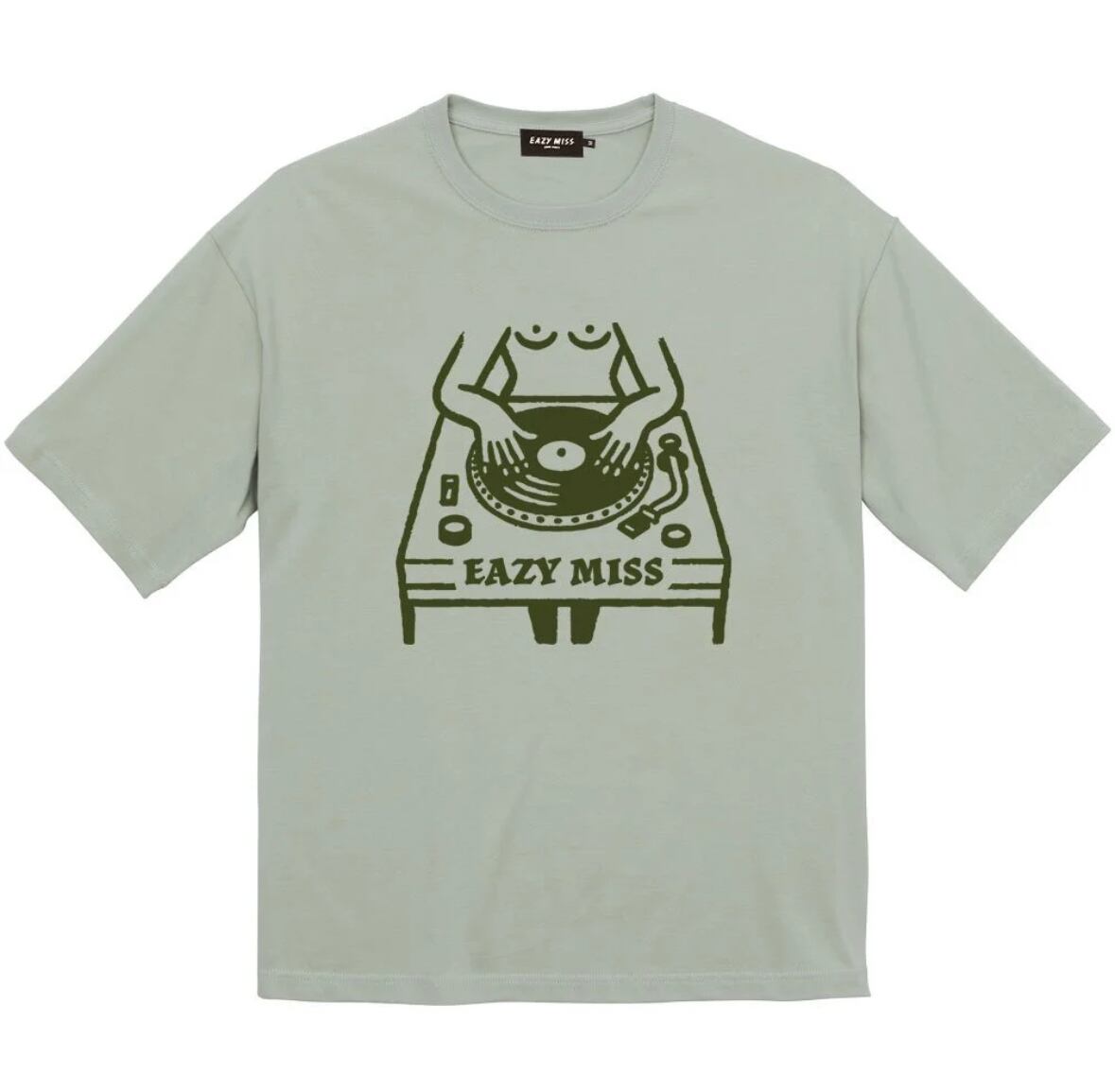 フロントのグラフィックは、DJをテーマにしたユニークなデザインで、「EAZY MISS」のブランド名をフィーチャーしています。DJブースでレコードを操るキャラクターは、音楽とファッションを愛する人々に向けた楽しいメッセージを発信しています。カジュアルながらも個性を主張するこのTシャツは、ストリートスタイルを好む人々にぴったりのアイテムです。