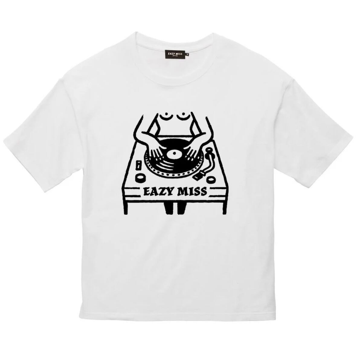 フロントのグラフィックは、DJをテーマにしたユニークなデザインで、「EAZY MISS」のブランド名をフィーチャーしています。DJブースでレコードを操るキャラクターは、音楽とファッションを愛する人々に向けた楽しいメッセージを発信しています。カジュアルながらも個性を主張するこのTシャツは、ストリートスタイルを好む人々にぴったりのアイテムです。